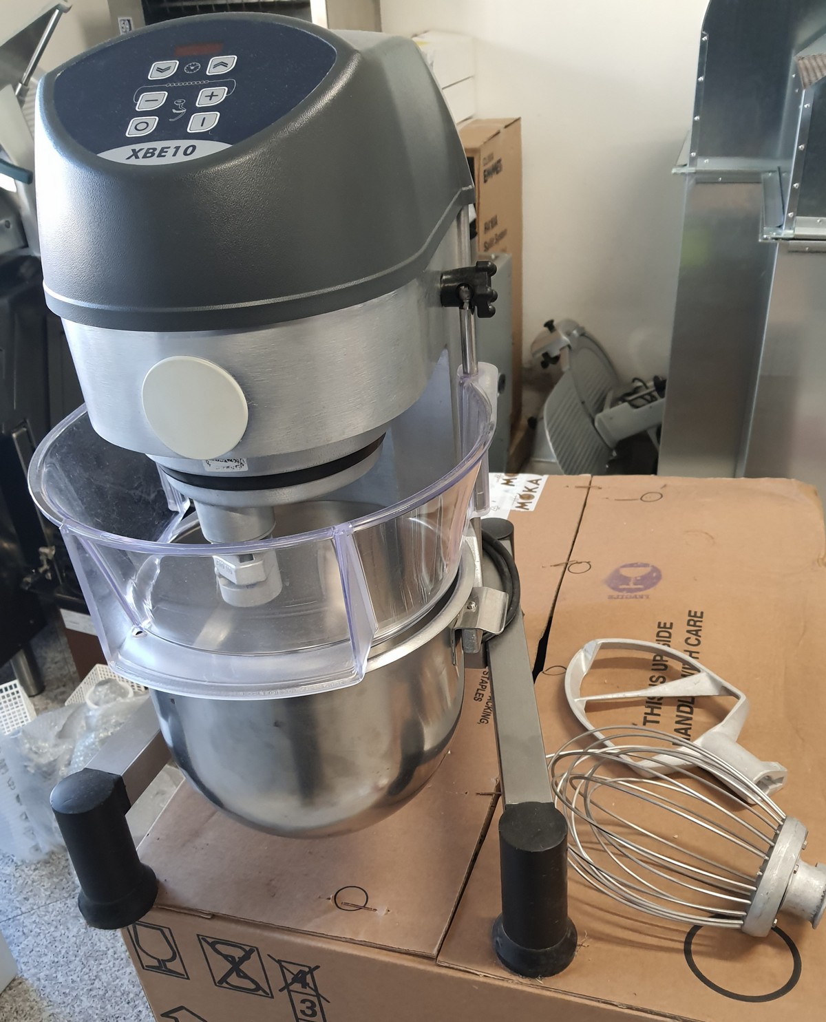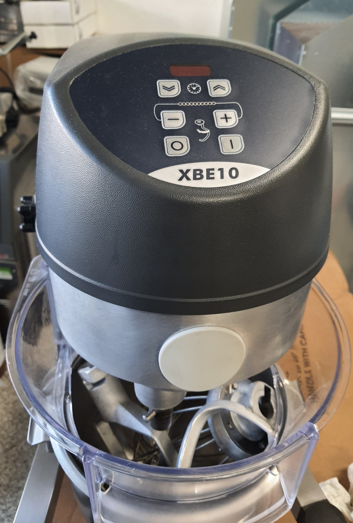 Mescolatrice planetaria ideale per impastare, mescolare, montare, ecc. Corpo, piedini e vasca da 10 litri in acciaio inox. Potente motore asincrono con variazione elettronica della velocità regolata da potenziometro (10 livelli da 26 a 180 giri/min.). Schermo trasparente di protezione che attiva il